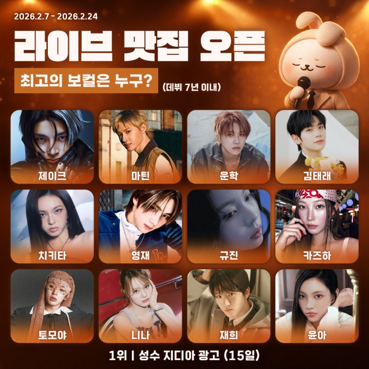 - ν›„λ³΄λŠ” 2025–2026λ…„ 1μ›” 31일 방영된 γ€ˆμ΄λ¬΄μ§„ μ„œλΉ„μŠ€γ€‰μ— μ†”λ‘œλ‘œ μΆœμ—°ν•œ μ•„μ΄λŒμ„ κΈ°μ€€μœΌλ‘œ μ„ μ •λ˜μ—ˆμœΌλ©°, 데뷔 7년을 κΈ°μ€€μœΌλ‘œ 2개 그룹으둜 ꡬ뢄해 νˆ¬ν‘œλ₯Ό μ§„ν–‰ν•©λ‹ˆλ‹€.